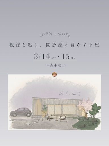 山梨県甲斐市竜王にて、2日間限定の見学会を開催します。 建築家・三浦直樹氏による、最小限の仕切りで最大限の広がりを生む設計。23坪とは思えない開放感と、家事負担を軽減する「最短の洗濯動線」をぜひ現地でご体感ください。 日時:3/14(土) - 15(日) 場所:甲斐市竜王(詳細は予約後にお伝えします) ※完全予約制・先着順